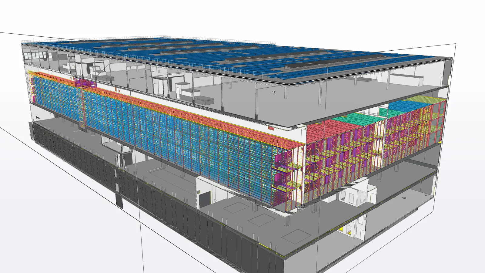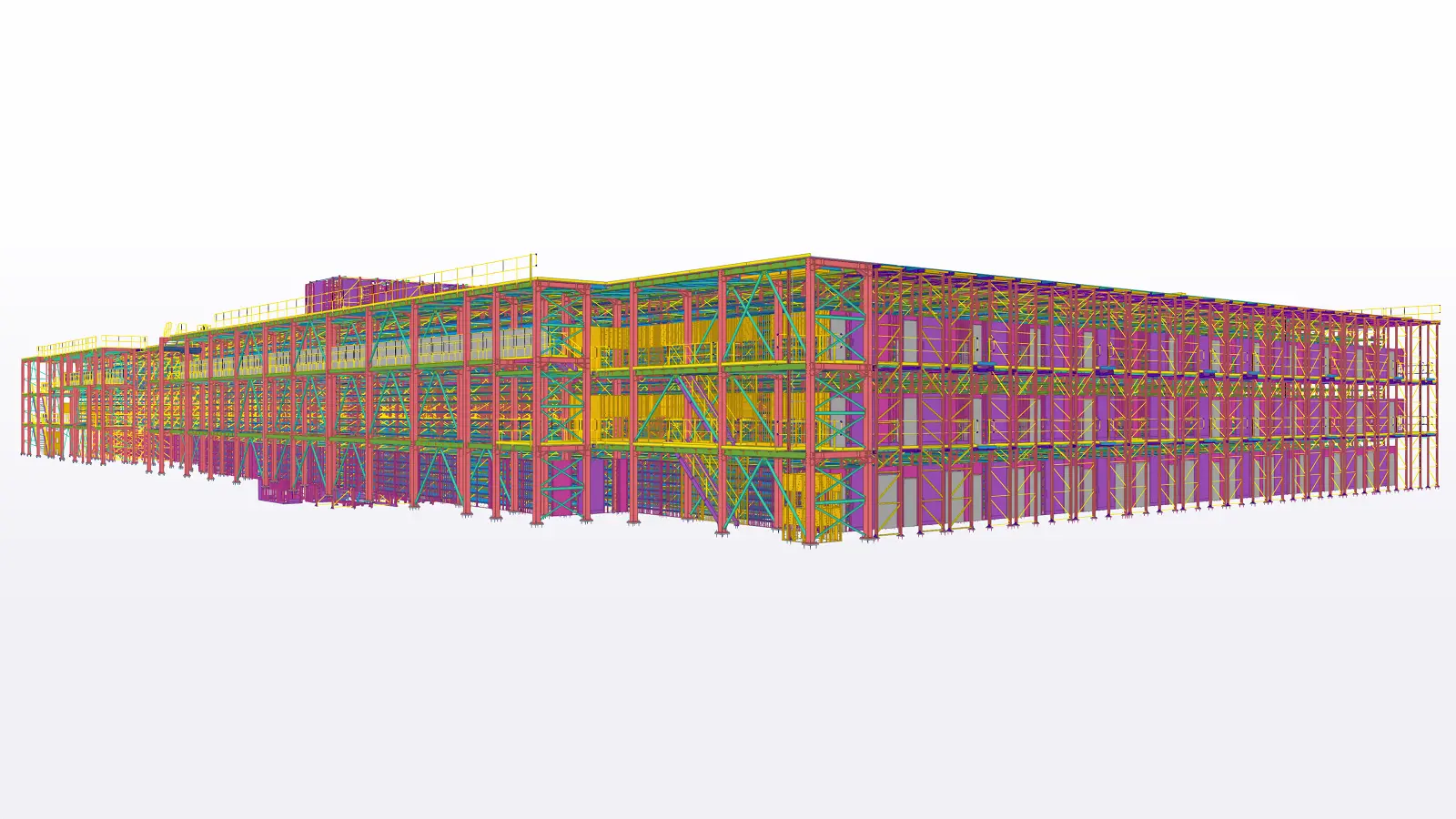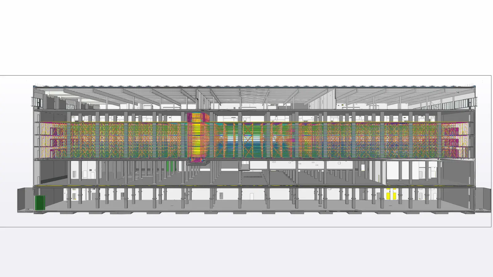 Celkový půdorysný rozměr konstrukce 123,0 x 58,0 m, výška 16,4 m. Hmotnost plošiny z válcovaných profilů 149 t, hmotnost regálu a plošin z tenkostěnných profilů 902,5 t.