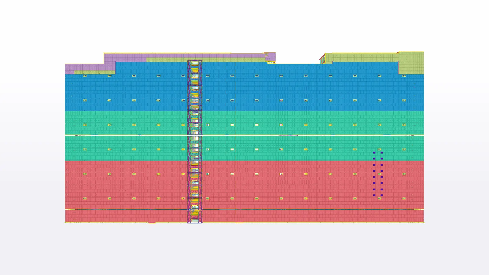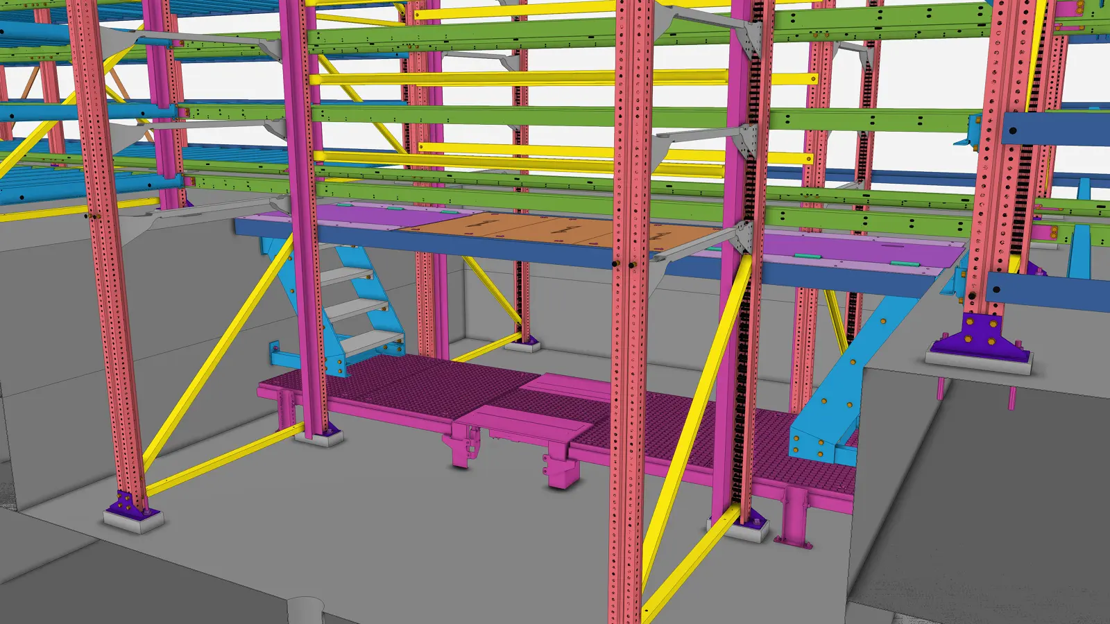 Předmětem řešení byla konstrukce 3. patrového regálu z tenkostěnných profilů s přístupovými plošinami a obslužní plošinou na vrcholu a tří plošin z válcovaných profilů.