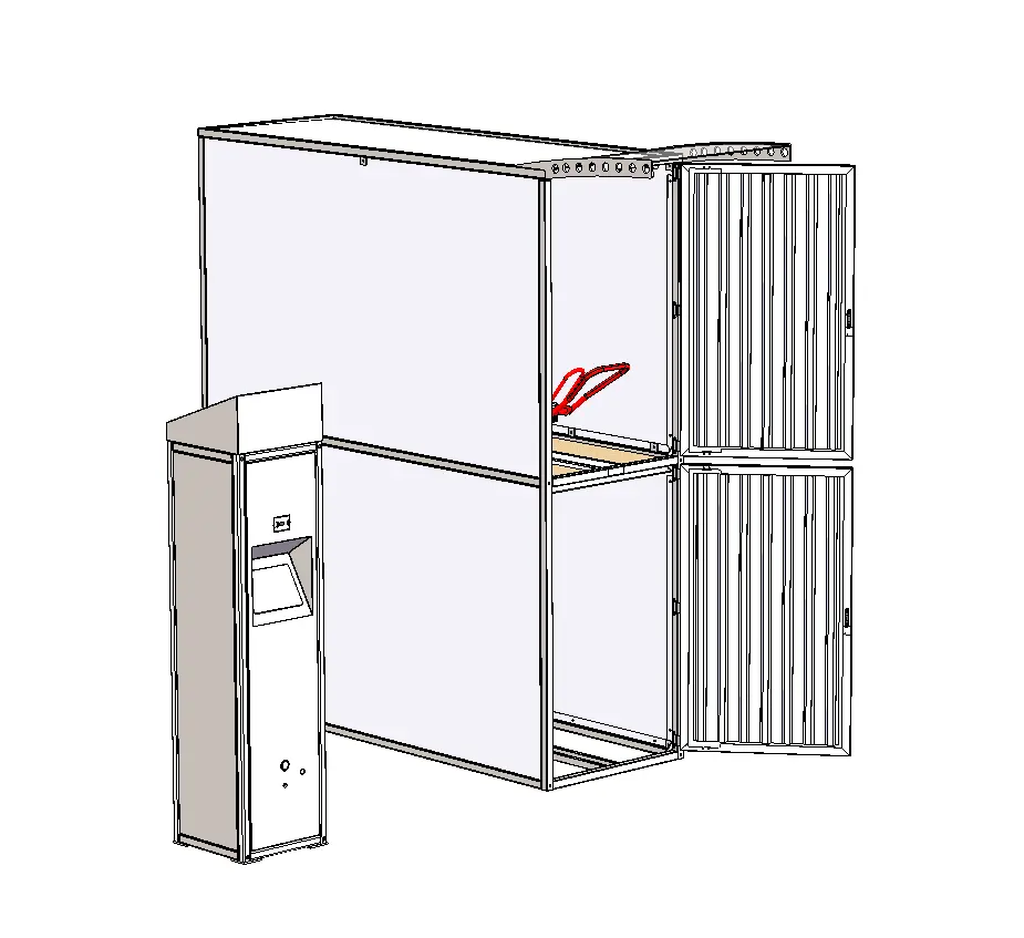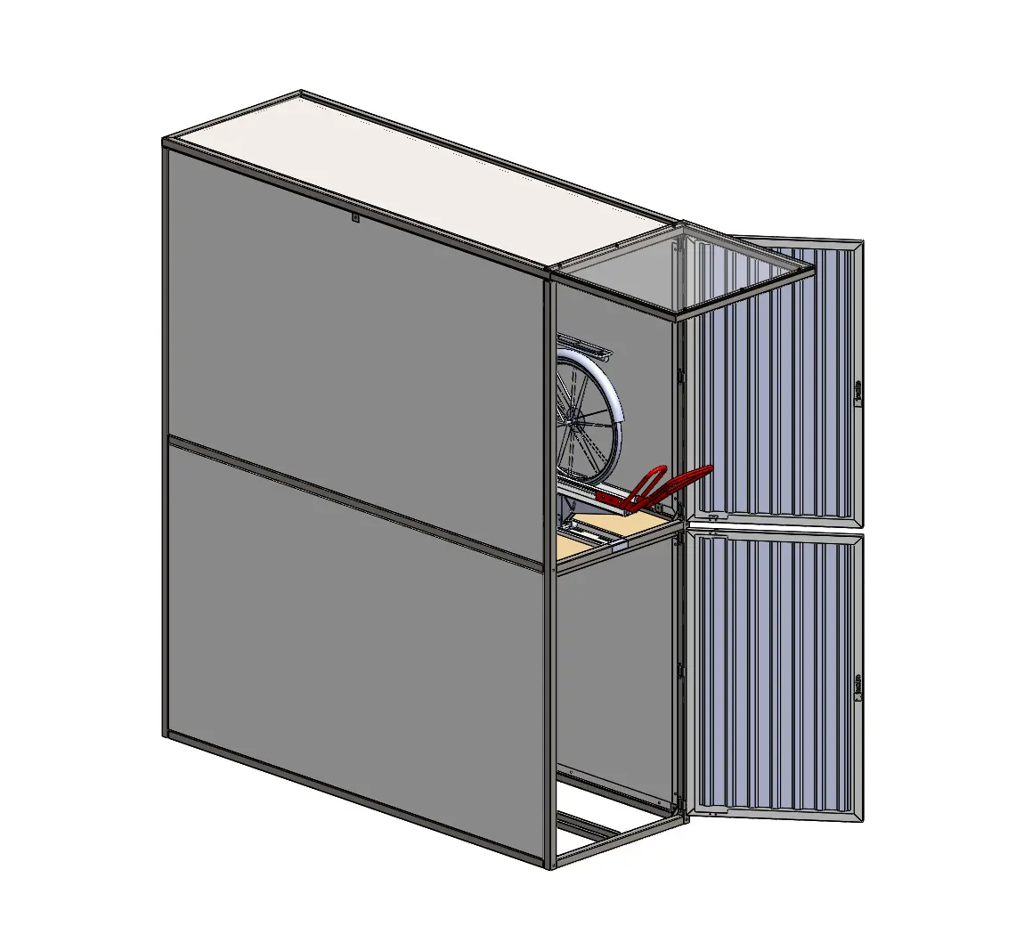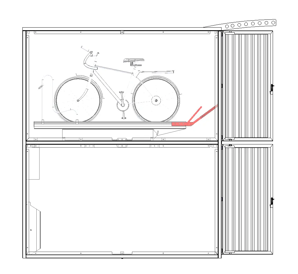Mechanický parkovací box (cyklobox) od firmy Digram-Ing s.r.o. je robustní, mechanické zařízení určené pro bezpečné uložení dvou jízdních kol podle normy DIN 79008. Box je rozdělen na horní a spodní parkovací prostor – spodní je určen pro ruční zasunutí kola, zatímco horní využívá výsuvnou lištu s madlem, která uživateli umožňuje kolo pohodlně nasadit, zvednout a zasunout. Díky mechanickému řešení bez potřeby napájení je cyklobox ideální pro veřejná nebo neveřejná stanoviště dokonce i bez elektrické infrastruktury. Konstrukce umožňuje montáž různých typů opláštění a zajišťuje ochranu kol i snadnou obsluhu.