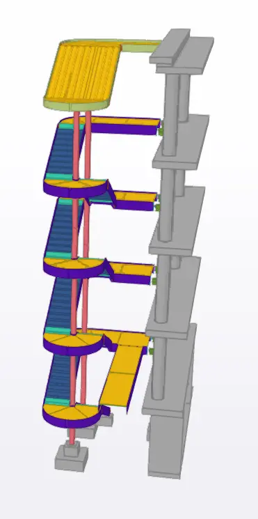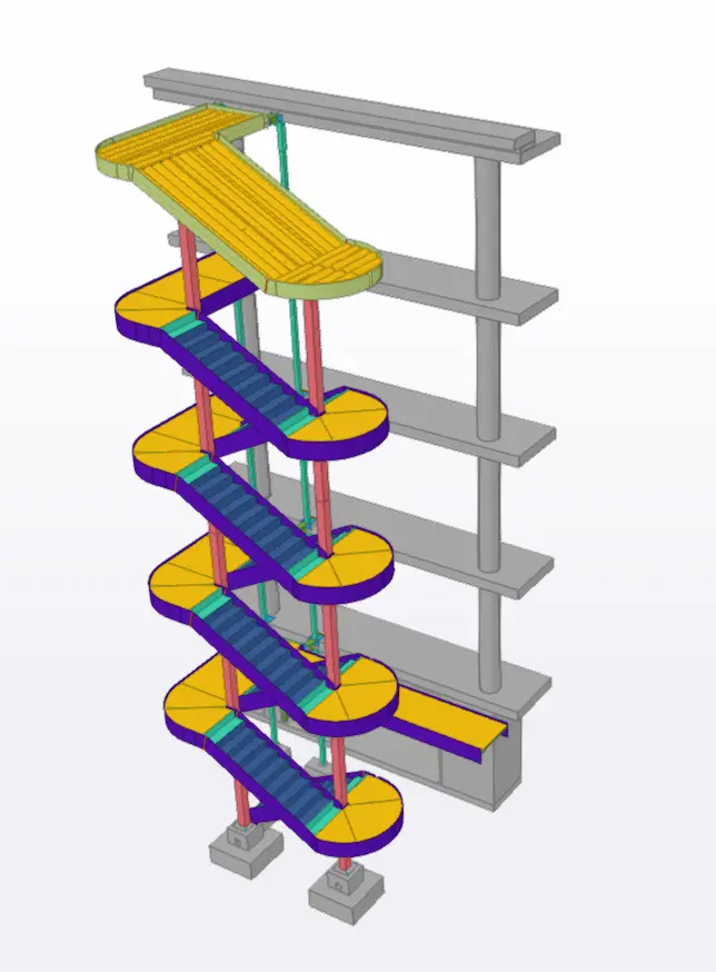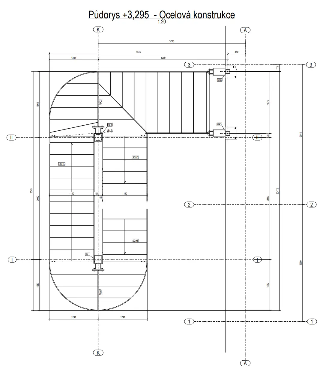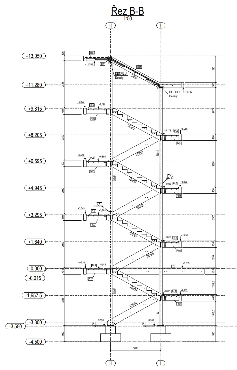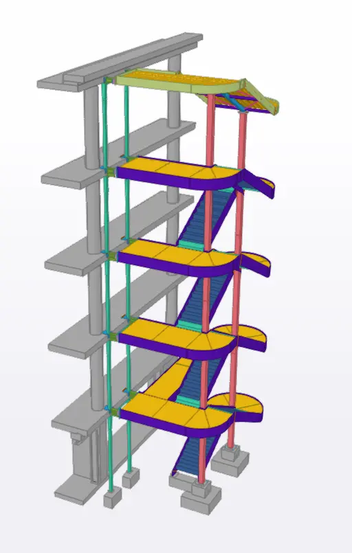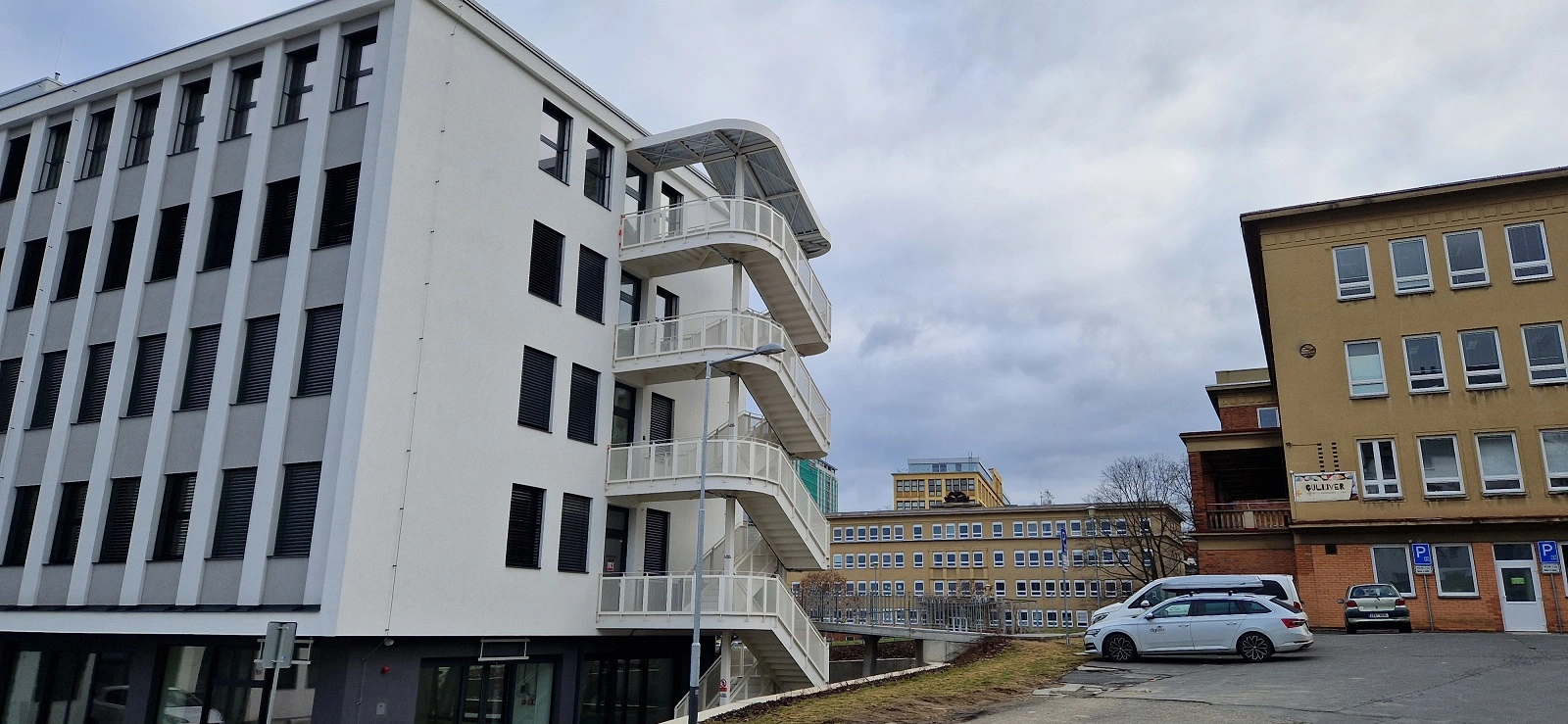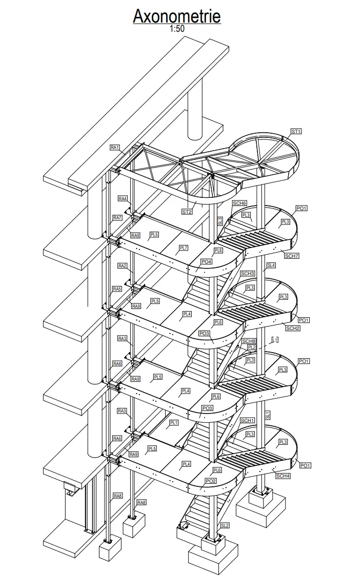 Komplex objektů v širším centru města Zlína prošel v r. 2021 komplexní rekonstrukcí. Naše společnost dodala výrobní dokumentaci pro ocelové konstrukce nových průvlaků, výměn a s nimi spojených sloupů, které bylo potřeba z důvodu montáže konstruovat jako teleskopické. Nejvýraznější částí je vnější únikové schodiště.