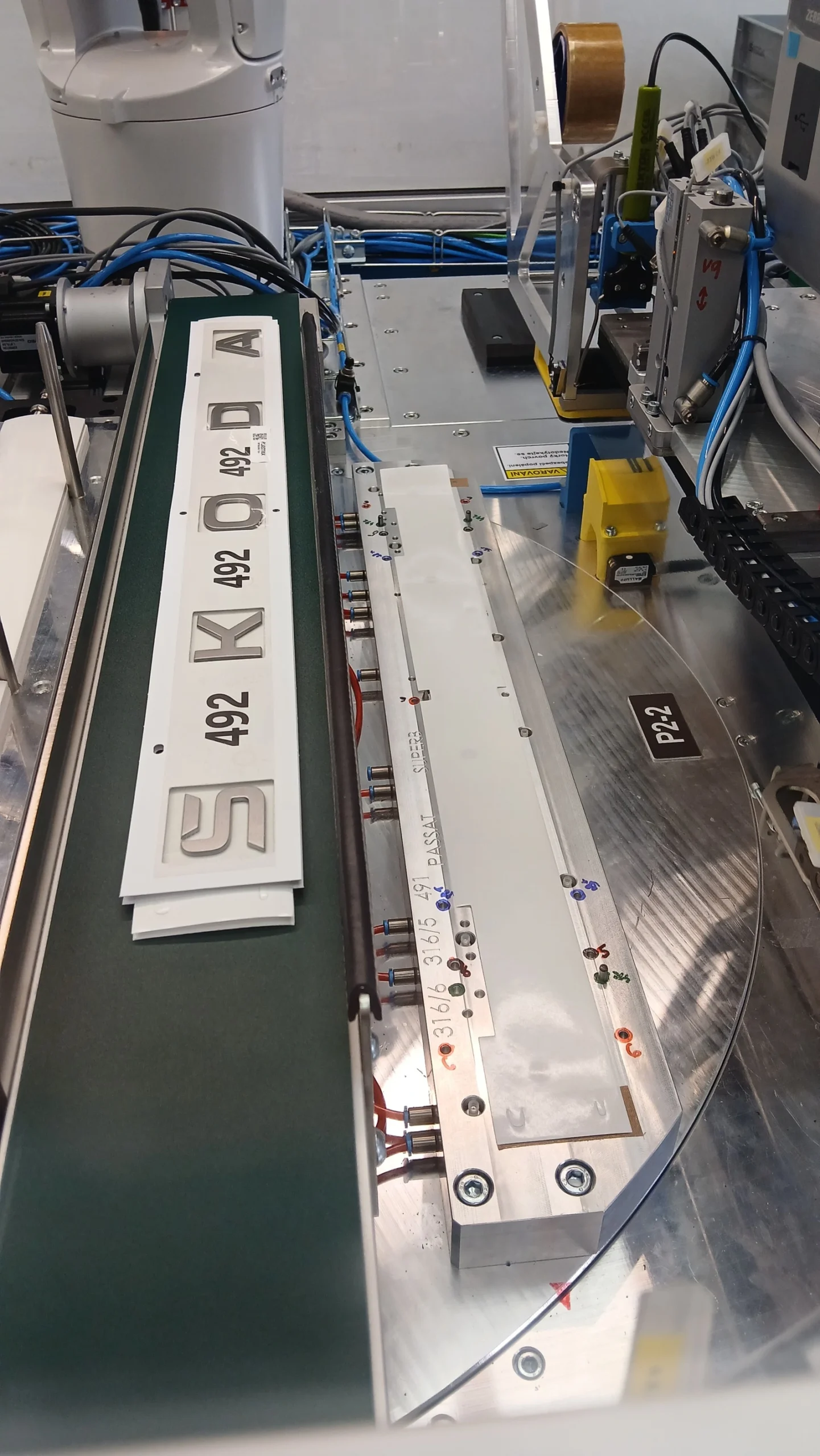 Zařízení pro výrobu nápisu „Škoda“ automatizované průmyslové zařízení určené k výrobě nejen nápisu Škoda“, ale i „Superb“ a „Passat“. Jedná se o zařízení, které instaluje oboustrannou pásku (negativ písmen nápisu) na výlisky nápisu Škoda“ s různou povrchovou úpravou. K pozicování oboustranné pásky bez použití kamery se odehrává s přesností na 0,1mm. Po nanesení pásky dojde k přeložení a separaci písmen nápisu tak, aby bylo možné ho poté umístit do aplikačních šablon – balící šablony. Zařízení je po výměně příslušenství schopno vyrábět i nápisy „Superb“ a „Passat“. Obsluha slouží u zařízení pouze k vkládání plastových výlisků a odebírání aplikačních šablon (hotových výrobků).