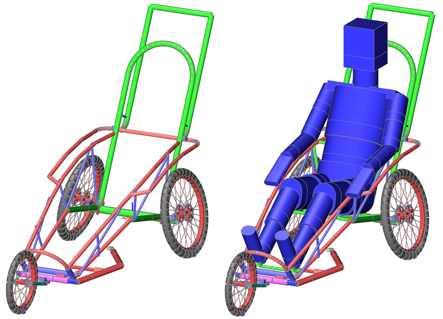 Pro analýzu takto speciální konstrukce bylo nutné vyvinout vlastní speciální metodiku pro zatížení vozíku. Vyvinuli jsme např. vlastní biomechanický model člověka pro co nejvýstižnější aplikaci zatížení vlastní tíhou a setrvačností lidského těla. Vyvinuty byly také speciální modely pro kola, pneumatiky a náboje kol.