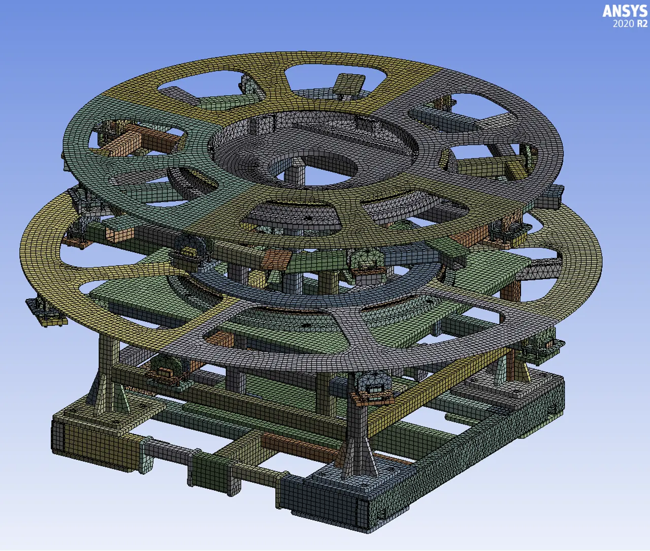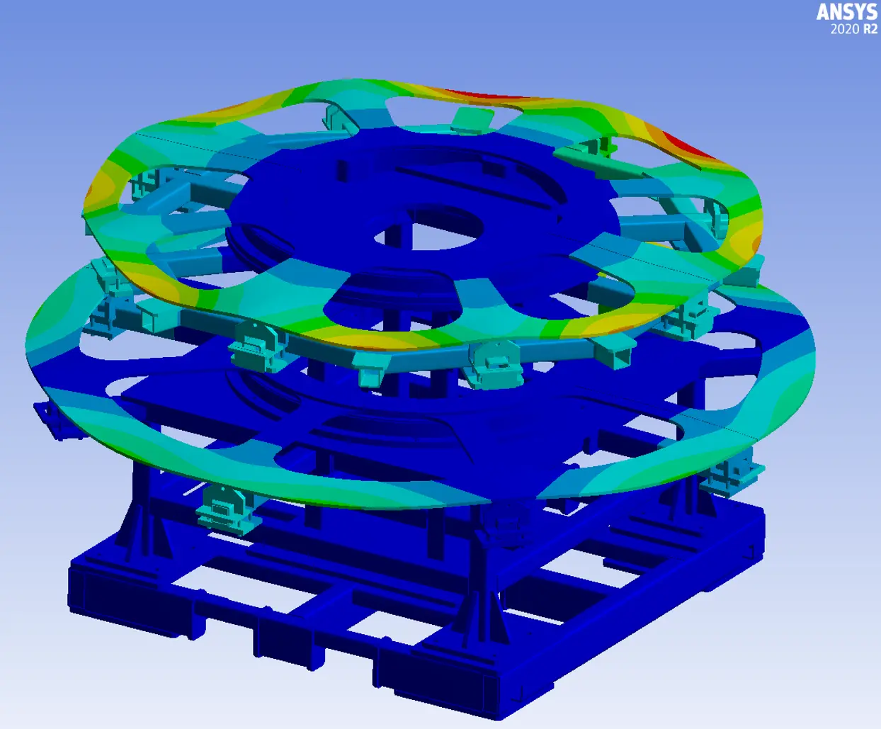 Pevnostní výpočet otáčecího stolu s kompletním rámem, stůl je součástí robotického pracoviště. Rám je ocelový, horizontální kotouče jsou vyrobeny z hliníku. Průměr zařízení je 2,2 m, výška 1,7 m.