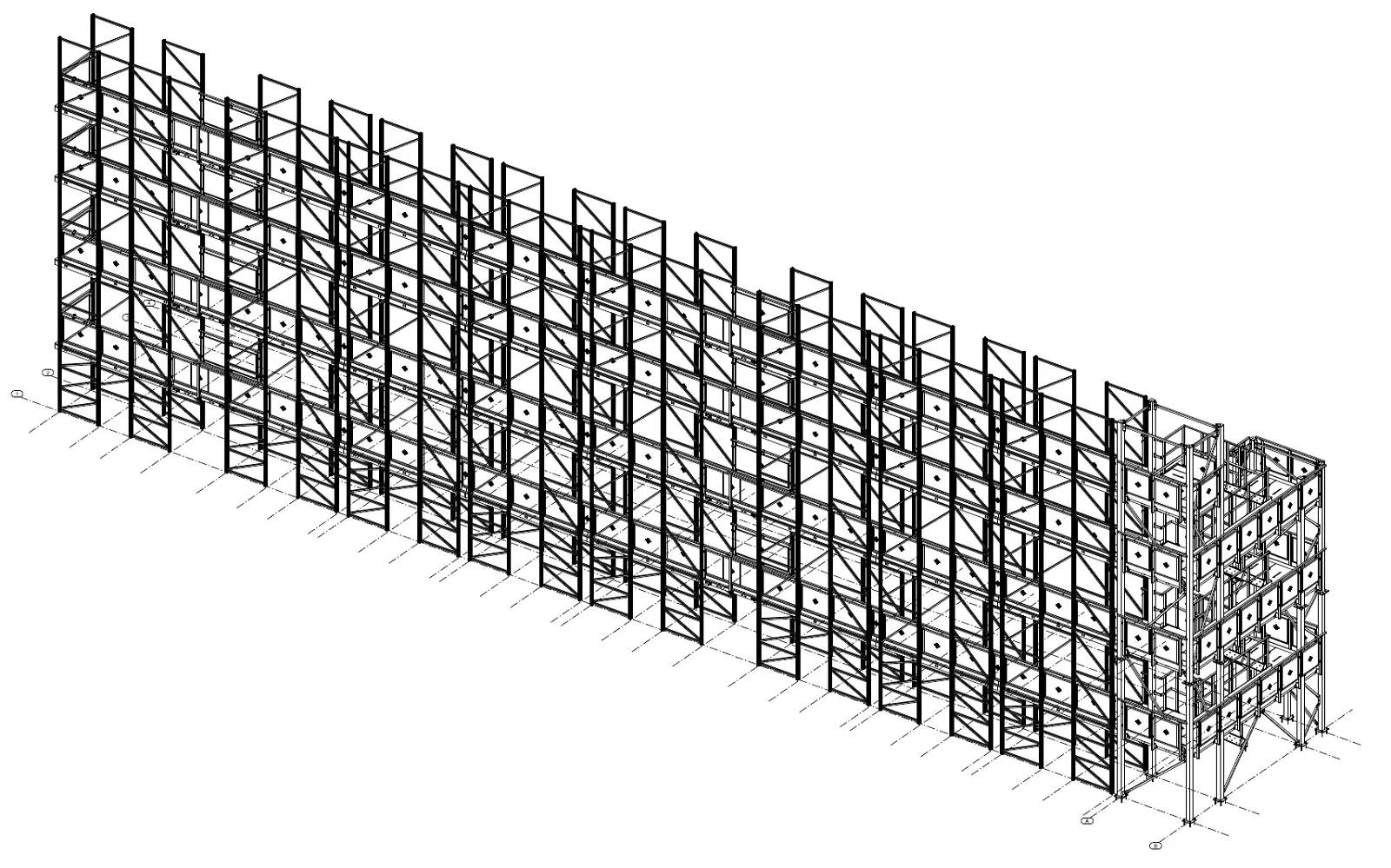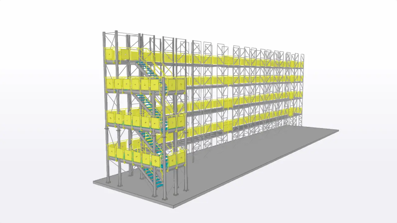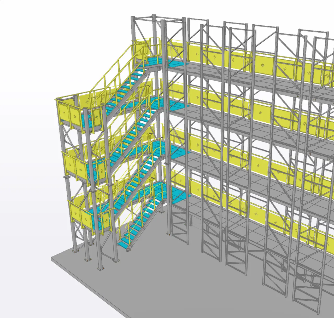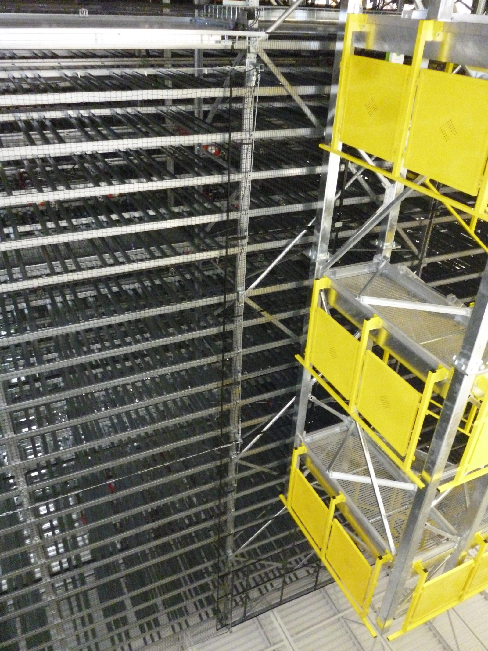 Přístupové schodiště půdorysu 6,5 x 2,5 m a celkové výšce 12,3 m a ocelové zábradlí na přístupové plošině k regálovému systému.